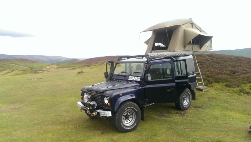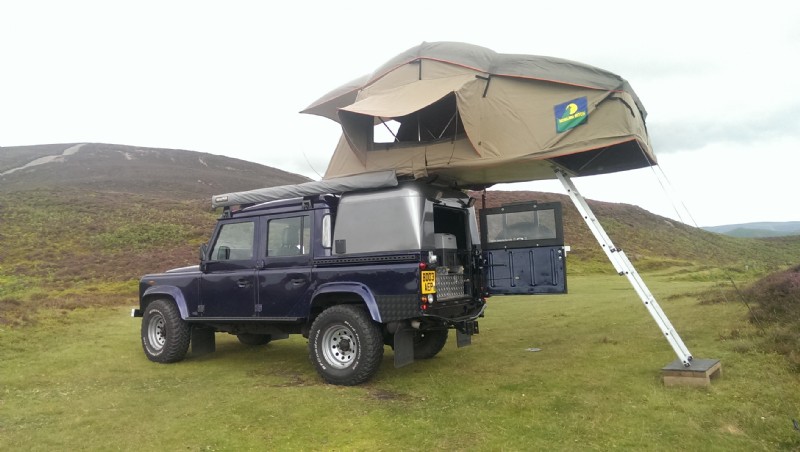 Heavy duty spare wheel carrier suitable for carrying an additional 80 litres of fuel in jerry cans with a bike carrier! Awning and roof rack. A roof tent with king size bed and memory foam mattress, led lighting and 12v dc.