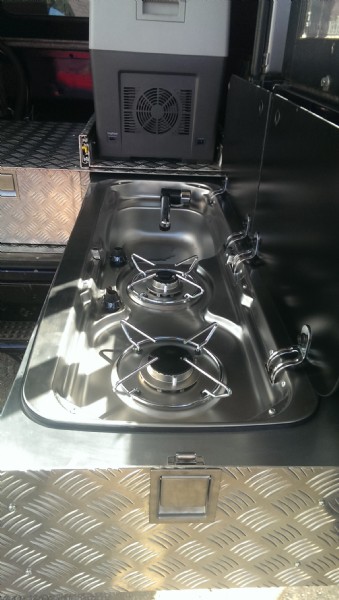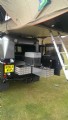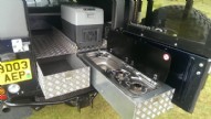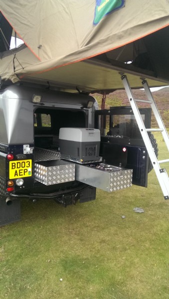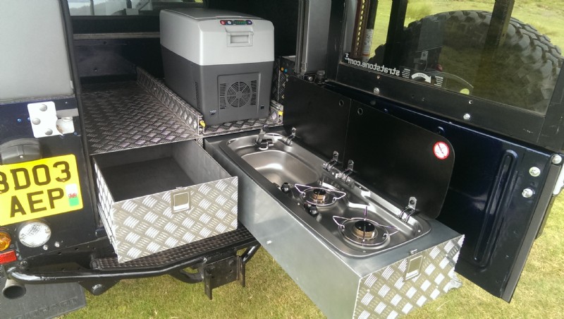 The rear tub has a sink, gas hob, fridge and all run on heavy duty drawer slides resulting in an easy access system giving plenty of convenient storage including a heavy duty drawer for all cooking and dining equipment. On board water storage and inter grated pump. Leisure battery. Led lighting, 12v dc charge points and an on board air compressor. Hi lift jack and tool storage.