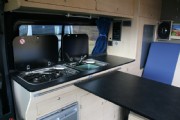 Sink, hot water system, hob and fridge. Gas hot air heating. Rock and roll bed with storage. Wardrobe, cupboard and drawer storage. 2x swivel seats with fold down table to suit 4 people for dinner. Fully upgraded sound system with Bluetooth and additional speakers. Flat screen TV or projector with receiver (optional), DVD and memory storage compatibility. Vinyl upholstery. Maple lightweight ply furniture and granite ply worktops and table. Led touch lighting, down lights and spots.