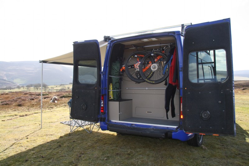 Rear “separate Garage” area with enough space to hang 2 bikes, sleep and travel 2 dogs or luggage and enough vented drying space for climbing equipment, outdoor kit and camper accessories (optional as a heated drying room with drip drain). Fully insulated